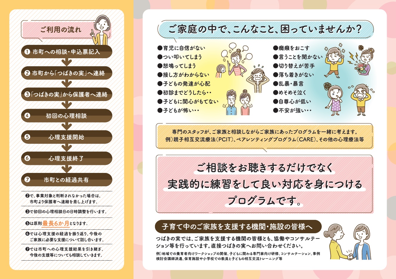 長崎県内の、子育てに悩む親と、生活の中での問題行動や悩みを抱える子どもへの心理支援を行うことを目的としています。つばきの実では、ご家庭はもちろん、子育て家庭を支援する、保育園や市町の子育て支援機関との協働や、児童福祉施設へのコンサルテーション、子どもに関わる専門職への研修も行っています。
